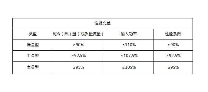 中溫型壓縮機或壓縮機組的制冷量、熱量或質量流量應大于等于92.5%,輸入功率小于等于107.5%,性能系數大于等于92.5%。